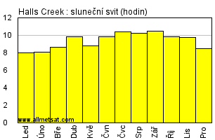 | Měsíční průměrný počet hodin slunečního svitu denně. |
