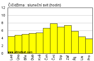 | Měsíční průměrný počet hodin slunečního svitu denně. |
